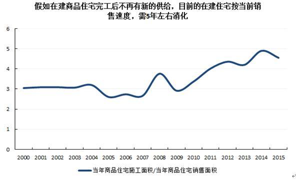 我們可以做另一個簡單的測算。假設現(xiàn)在在建的房屋全部建成,但之后沒有任何新的開工項目,那么按照現(xiàn)有的需求,我們需要幾年才能消化這些供給?可以看到,這個數(shù)字不斷攀升。到2015年底,在建的居民住宅按照2015年的銷售速度需要5年才能消化完。這個數(shù)字還應該被低估了,因為沒有算上已經(jīng)建成但還未銷售出去的那部分住宅。