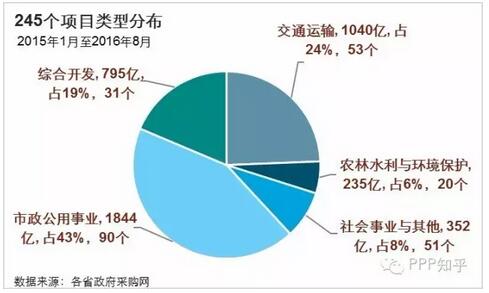 從項目類型占比情況來看,總金額占比最大的為市政公用事業類項目,規模為1844億,占總項目金額得43%,項目個數也排名第1,總共有90個,市政公用事業類項目包括軌道交通、停車場、地下綜合管廊、海綿城市建設、城市黑臭水體整治、市政路橋、供水、排水及污水處理、供氣、供熱、供電、園林綠化、垃圾處理、農村污水垃圾治理等;金額排名第2的是交通運輸類項目,總規模1040億,占24%,共有53個項目,交通運輸類項目有公路、橋梁隧道、鐵路、民航、水運、公交系統、物流系統等;綜合開發類項目排名第3,金額795億,占19%,有31個項目,這類型項目有城鎮綜合開發、環境綜合治理、保障性安居工程、智慧城市等。