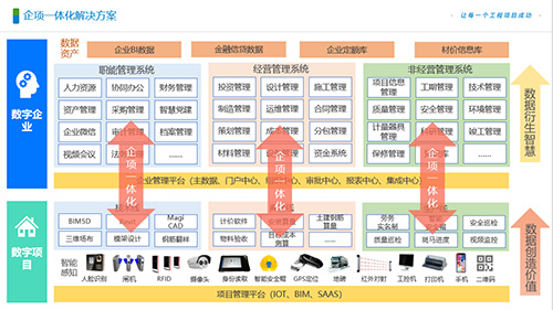 在企項一體化整體方案下,在數字項目層,通過智能安全帽,閘機,地磅等各種智能硬件以及BIM技術實現現場智能化管理。在數字企業層,目前,企業通過智能管理系統、經營管理系統以及非經營管理系統實現企業對多項目的管理,這時只有通過實現了智能化采集和智能化管理的一體化平臺,實現智能采集以及數據的互聯互通,才能實現數字企業和數字項目的融合統一,真正利用數字化來實現企業的智能化管理。