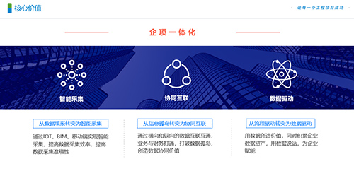 企項一體化最直接的效果就是數據的互聯互通,通過橫向各部門之間的數據互聯互通,以及縱向公司與項目之間的互聯互通來打通項目與企業數據,打通業務與財務數據,最終創造數據協同價值。