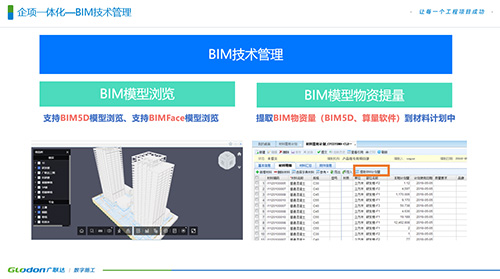 在項目上,除了智能采集以及移動端應用以外,企項一體化還可以在不安裝復雜的BIM模型工具的情況下,實現BIM的技術管理。比如BIM模型的可視化,在企業項目管理平臺中可以直接在網頁端瀏覽BIM模型,查看模型的漫游以及查看某個單體樓層或某個構件。另外,公司人員可以在項目管理系統中查看各個項目的BIM模型數據,還可以直接從BIM模型中提取物資量到總量計劃、部位計劃、需求計劃等材料計劃中,實現企業BIM輕量化應用。