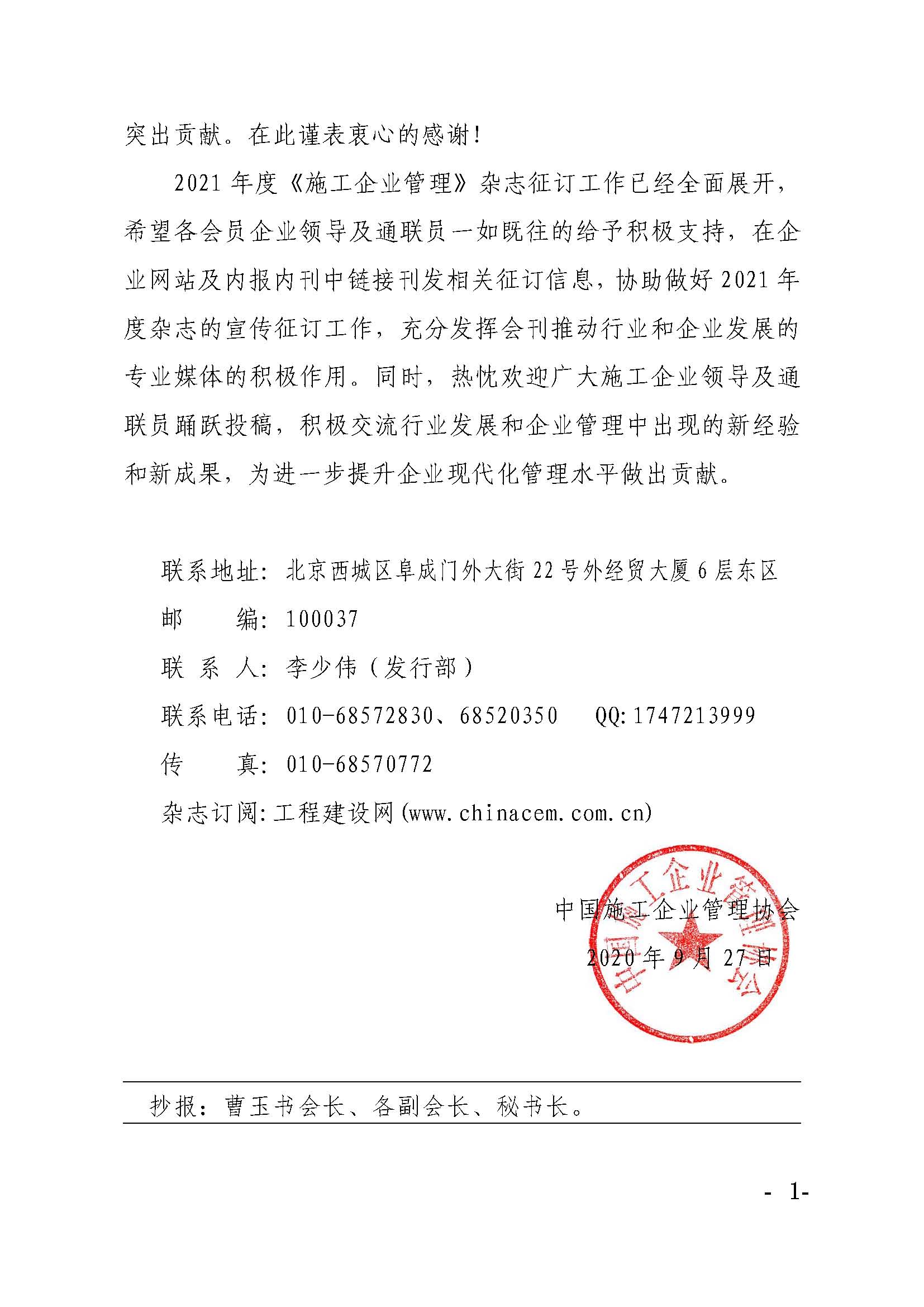 關于協助做好2021年會刊《施工企業管理》宣傳征訂工作的通知