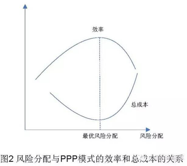 風(fēng)險分配的目的是要達到最優(yōu)的、最合理的公平風(fēng)險分配,認為“采用PPP模式就是要把盡量多的風(fēng)險轉(zhuǎn)移給私人部門”和“承擔(dān)較多的風(fēng)險就可以獲得較多的回報(從而把承擔(dān)風(fēng)險看成是獲得高額回報的機會)”是錯誤的。事實上,讓私人部門承擔(dān)其無法承擔(dān)的風(fēng)險,一旦風(fēng)險發(fā)生時又缺乏控制能力,必然會降低提供公共設(shè)施或服務(wù)的效率和增加控制風(fēng)險的總成本(包括公共部門的成本)。提供公共設(shè)施或服務(wù)的效率(簡稱“效率”)和控制風(fēng)險的總成本(簡稱“總成本”)與風(fēng)險分配的關(guān)系如圖2所示。可以看出,效率和總成本與風(fēng)險分配的關(guān)系不是簡單的正相關(guān)或負相關(guān)的關(guān)系,只有達到最優(yōu)風(fēng)險分配時,才能達到效率最高和總成本最低。