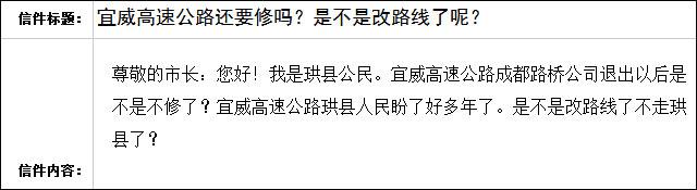 早在2014年,成都路橋就已中標宜威高速公路四川境段BOT(建設-經(jīng)營-移交)項目。當時的消息稱,該項目預計總投資82億元,計劃施工工期為4年。掐指一算,現(xiàn)在已經(jīng)2018年了,項目進展如何了呢? 近日,已有熱心網(wǎng)友在宜賓《市長與網(wǎng)民》信箱咨詢,留言如下——