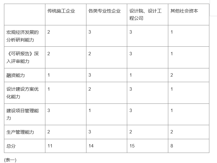 從上表可以看到,設(shè)計(jì)院、設(shè)計(jì)工程公司的基本能力最強(qiáng),排在第二、三位的是各類專業(yè)性公司和傳統(tǒng)施工企業(yè),能力最差的是其他社會(huì)資本。