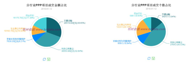 3.從行業(yè)分布情況看,市政公用、交通運(yùn)輸分居成交金額和成交數(shù)量的第一、二位。