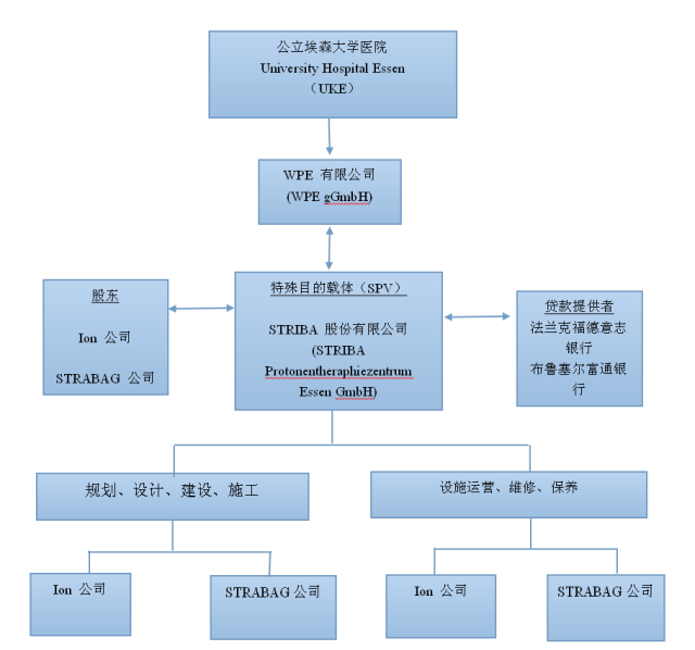 西德質子治療中心(West German Proton Therapy Centre, WPE)是位于德國西部埃森(Essen)市的一家公共醫療機構,專門用于癌癥的放射治療。在2005 年初的時候,德國政府就在全歐洲范圍內進行此項目的招標,12 月份即選定兩個中標人Ion Beam Applications S.A.(Ion 公司)與STRABAGProjektentwicklung GmbH(STRABAG 公司),并于2006 年6 月簽訂合約,開始WPE PPP項目的投資建設。2009年底第一個治療室建成啟用,截止目前第一批共四個治療室已經全部投入使用,未來還將繼續投資建成三個治療室,可見WPE PPP項目的實施還是很成功的。