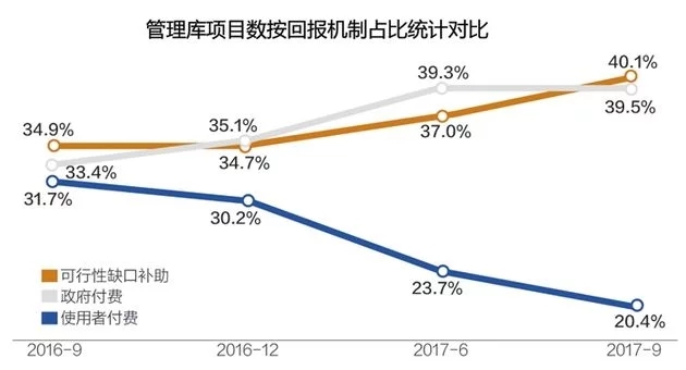 根據財政部全國PPP綜合信息平臺項目庫第8期季報披露的情況,如果按回報機制來進行統計,在管理庫的項目總數當中,截至2017年第三季度末,有39.5%屬于政府付費項目,如果算上政府市場混合付費的“可行性缺口補助類”項目,占比達到近80%,而且從2016年以來這一比例呈逐季提升之勢;而如果按管理庫項目的投資額來統計,政府付費項目和可行性缺口補助類項目的占比則已經超過了80%,其占比同樣也是逐季上升。