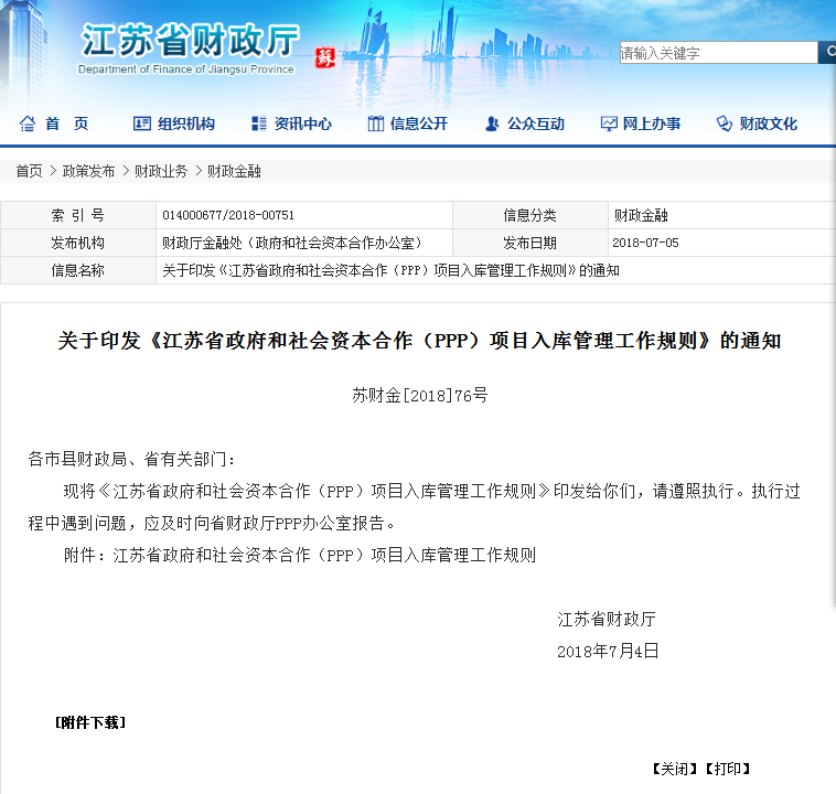 關于印發《江蘇省政府和社會資本合作(PPP)項目入庫管理工作規則》的通知