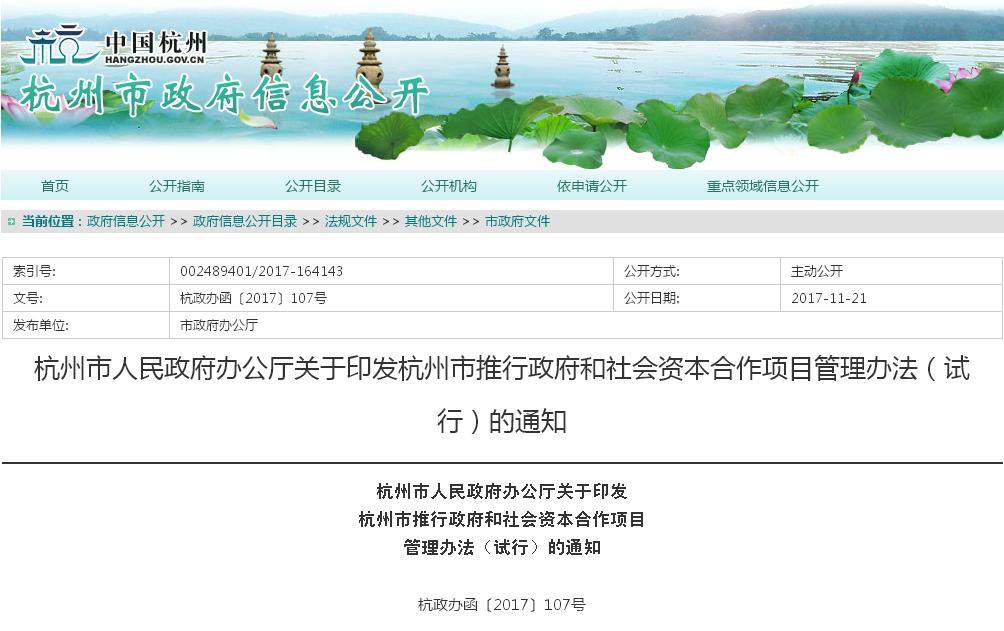 《杭州市推行政府和社會資本合作項目管理辦法(試行)》已經(jīng)市政府同意,現(xiàn)印發(fā)給你們,請認(rèn)真組織實施。