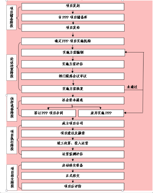 6.實施方案審查審批。對于市本級項目,實施機(jī)構(gòu)將PPP項目實施方案報市發(fā)改委,市發(fā)改委委托市PPP中心對實施方案進(jìn)行評估論證,并出具評估意見。PPP實施方案經(jīng)部門聯(lián)席會議審查通過后,由項目實施機(jī)構(gòu)報市政府審批。實施方案已通過審批的PPP項目,可以開展下一步工作;未通過審批的,可對實施方案進(jìn)行調(diào)整后重新審批;經(jīng)重新審批后仍不能通過的,不得采用PPP模式。對于各區(qū)、縣(市)項目,仍由屬地政府自行開展PPP項目實施方案的審查審批工作。