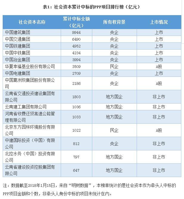 截至2018年1月15日,全國累計的PPP項目成交金額合計93616億元,其中前15強企業(yè)中標金額總計高達45168億元,占比48%。 全國的PPP大牛都有哪些企業(yè)?我們看看截至到2018年1月15日的統計數據(表1):