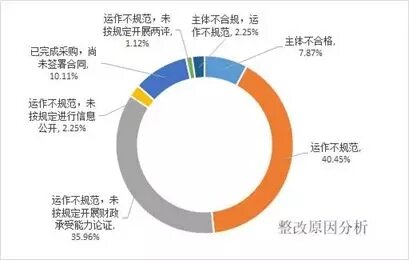 (3)保留示范但限期整改。對于運作模式不規范、采購程序不嚴謹、簽約主體存在瑕疵的89個項目,請有關省級財政部門會同有關方面抓緊督促整改,于6月底前完成。逾期仍不符合相關要求的,調出示范項目名單或清退出項目庫。整改原因中,“運作不規范”占82%,其中“未按規定開展財政承受能力輪漲”占36%、“主體不合規”7.9%、“未按規定進行信息公開”2.25%。其他整個原因則是“已完成采購,尚未簽署合同”占10%、主體不合格占7.87%。