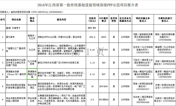 此次公布的項目是省發改委按前期工作比較成熟、適合社會資本對接的原則篩選出來的18個項目,總投資共計327.93億元。其中,昌九客專項目是PPP模式推進實施的省級重點重大項目,擬采用BOOT模式實施,投資回報機制為“使用者付費+可行性缺口補助”。