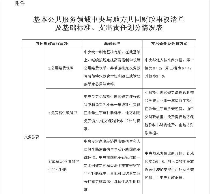 附件:基本公共服務領域中央與地方共同財政事權(quán)清單及基礎標準、支出責任劃分情況表