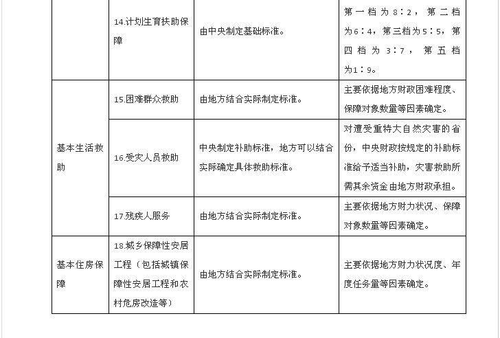 根據(jù)地區(qū)經(jīng)濟社會發(fā)展總體格局、各項基本公共服務的不同屬性以及財力實際狀況,基本公共服務領域中央與地方共同財政事權(quán)的支出責任主要實行中央與地方按比例分擔,并保持基本穩(wěn)定。具體明確和規(guī)范如下: