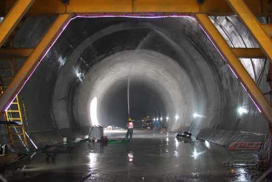 十八局四公司建設者在京張高鐵東花園隧道對襯砌混凝土進行噴水養護