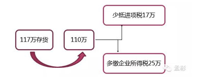 圖中大家可以看到,企業(yè)原本117萬購買的貨物因不要發(fā)票而支付110萬,少支付進貨成本7萬元,但由于沒有取得發(fā)票,導致企業(yè)少抵扣進項稅17萬,因無發(fā)票不能在企業(yè)所得稅前扣除而多繳企業(yè)所得稅25萬,綜合損失35萬。