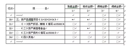 32.第32行“(二)資產減值準備金”:填報壞賬準備、存貨跌價準備、理賠費用準備金等不允許稅前扣除的各類資產減值準備金納稅調整情況。第1列 “賬載金額”填報納稅人會計核算計入當期損益的資產減值準備金金額(因價值恢復等原因轉回的資產減值準備金應予以沖回);第1列,若≥0,填入第3列“調增金額”;若<0,將絕對值填入第4列“調減金額”。