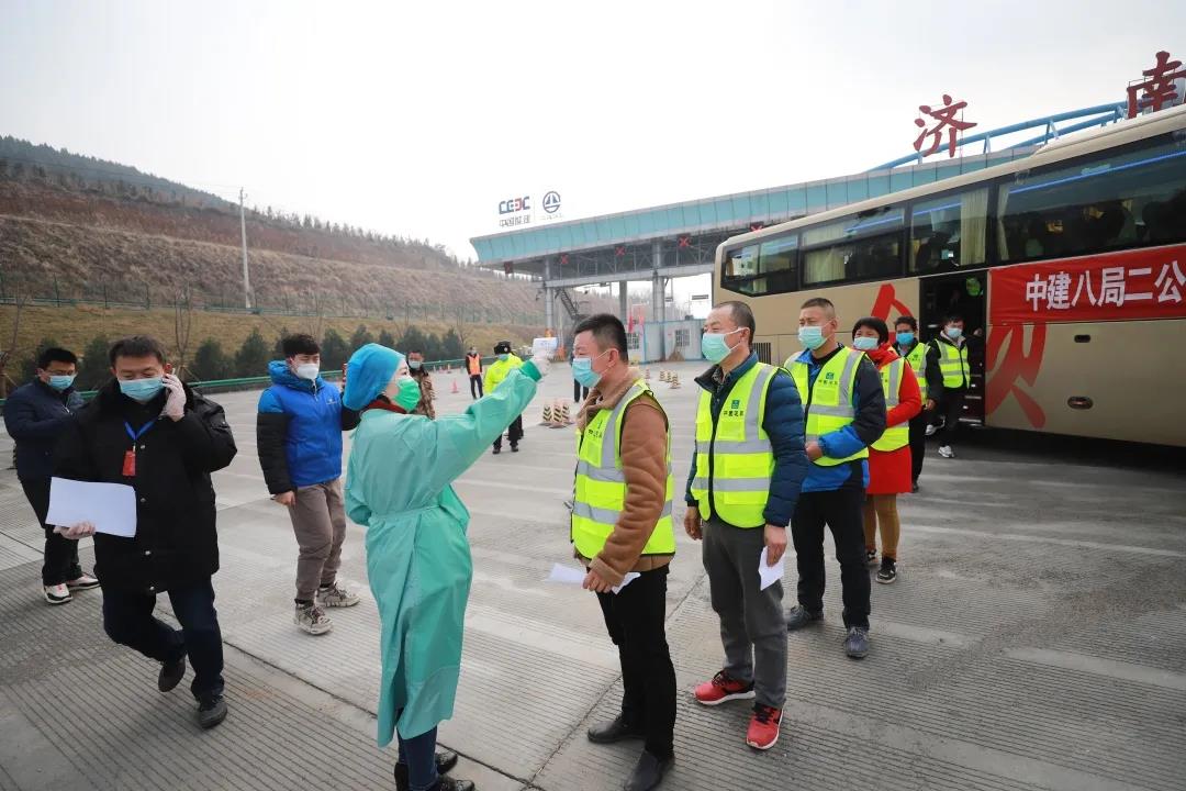 在濟南市住房和城鄉(xiāng)建設局的靠前服務和指導支持下,二公司首批辦理通行證,5輛大巴車24小時內(nèi)集合完畢,從濟南出發(fā)分赴四川、河南、江蘇等地,專程接回102名工友復工,總里程長達12000公里。月底前,還將從濟南發(fā)出38輛大巴往返接回工友,保障4000名工友到崗,從全國發(fā)出100余輛專車,奔赴河南、山東、貴州、江蘇、四川、重慶、江西等省份,預計月底前保障3萬名工友上崗。