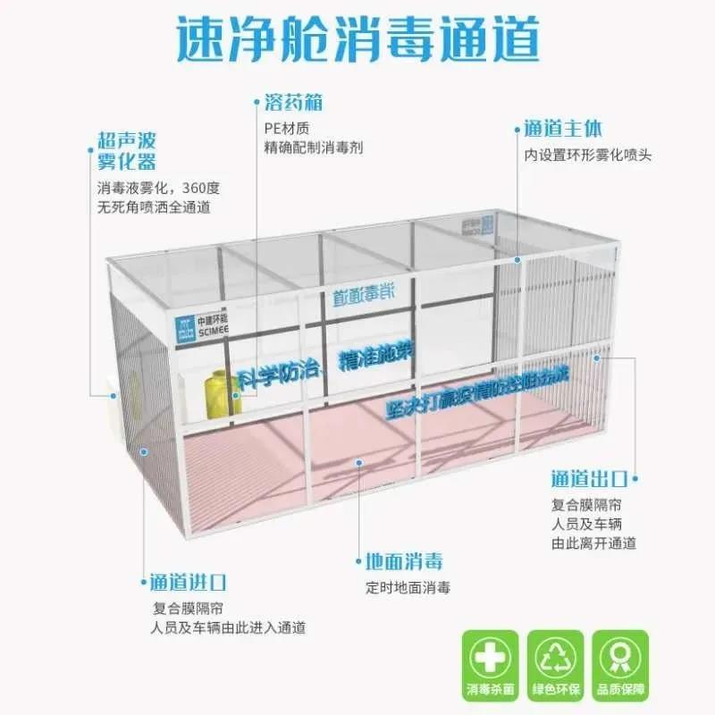 中建發展統籌中建環能研發的“速凈艙”,便捷高效地解決人流密集場所人員及車輛防疫消毒的難題。外箱通道為環保PC材質,安全無毒無異味、抗沖擊性強、抗老化。采用模塊化組合,運輸、搭建方便快捷。